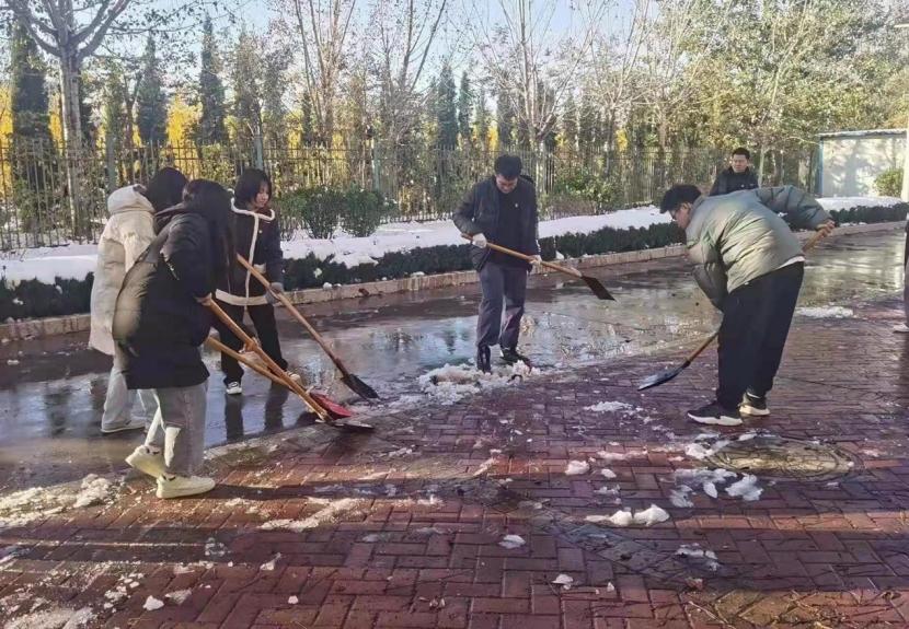 大家无畏严寒,无畏冻得发麻的手指,用铁锹和雪铲将积雪和冰面清扫干净,全身心的给师生群众清扫畅通道路,保障出行安全。路过的师生纷纷投来赞许的目光。经过几个小时的奋战,扫雪除冰任务圆满完成。