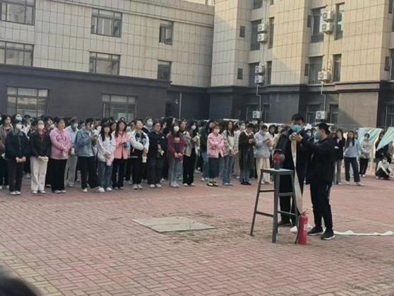 在老师的带领下,同学们弯着腰用湿毛巾捂住口鼻有序撤出宿舍,按照安全出口的指示快速前进,撤离到宿舍楼下的安全地点,撤离过程井然有序。并有专业人士现场给同学们讲解、示范了干粉灭火器的正确使用方法,利用“一提二拔三瞄四按”的顺口溜帮助同学们更好地记住干粉灭火器的使用步骤。
