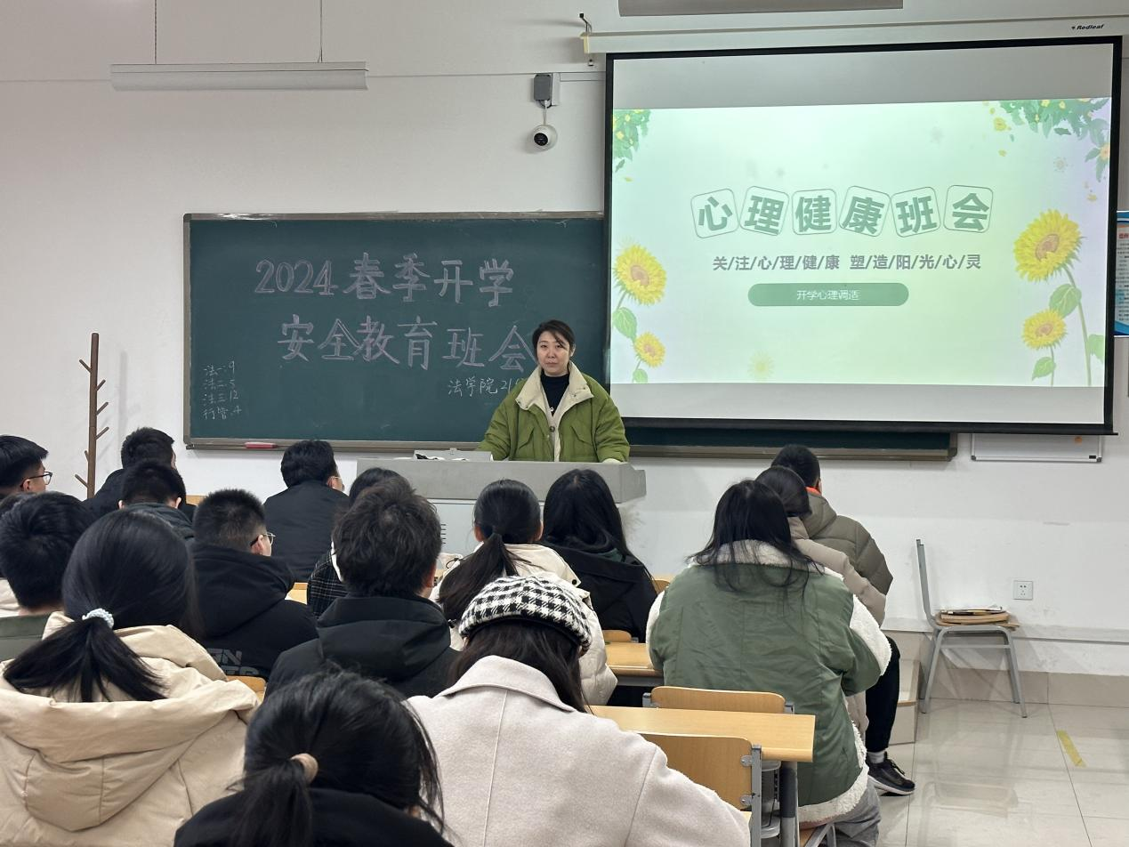 新学期伊始,为了帮助同学及时调整心理状态,更好地适应新学期,以更加积极饱满的状态投入到新学期的学习中,法学院各班于2024年2月25日-28日召开新学期心理健康主题班会。