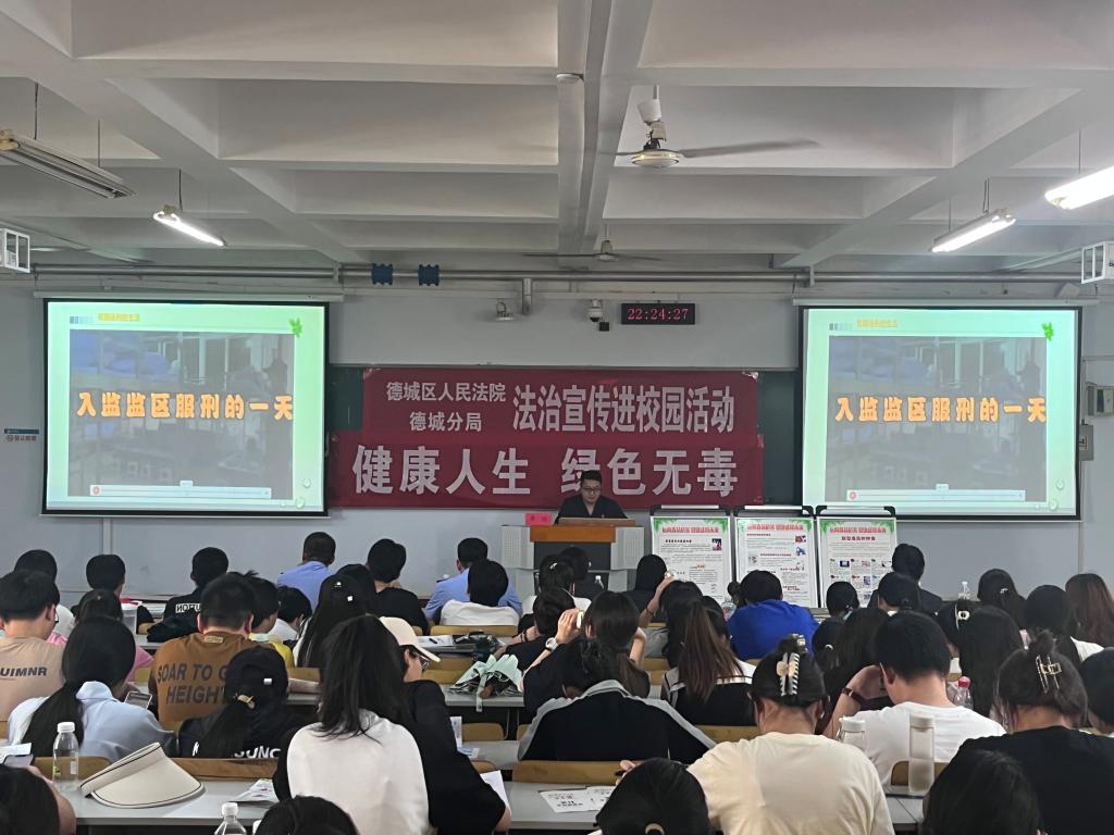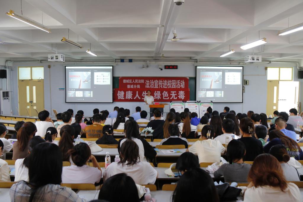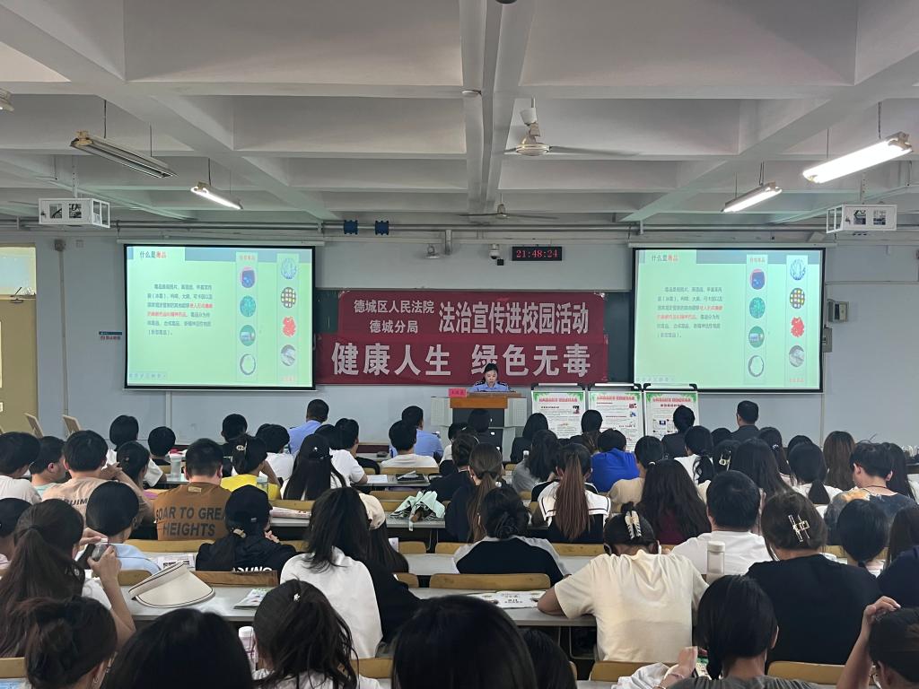 德城区法院刑事审判庭法官助理房瑞做了题为《切莫大意成为网络犯罪帮凶》的普法报告,德州市公安局德城分局禁毒大队民警王晓晨做了《护航青春成长 防范青少年药物滥用》禁毒宣传讲座,两场报告呼吁广大学生共同营造“健康人生 绿色无毒”的法治生态环境。