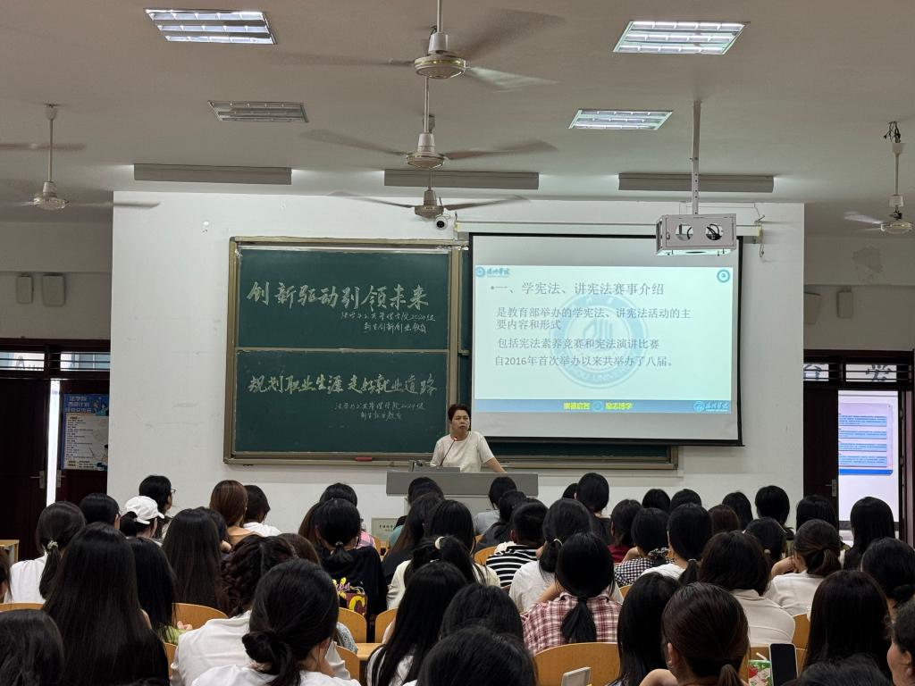 学院专业技能竞赛负责人孙桂燕老师向2024级新生介绍了全国大学生“学宪法、讲宪法”竞赛的举办背景、活动目的、参赛流程、竞赛环节等内容,并结合对国家级比赛的指导经验,对新生在培育创新思维、逻辑思维、实践能力、现场应变能力等方面的快速提升提出宝贵建议。