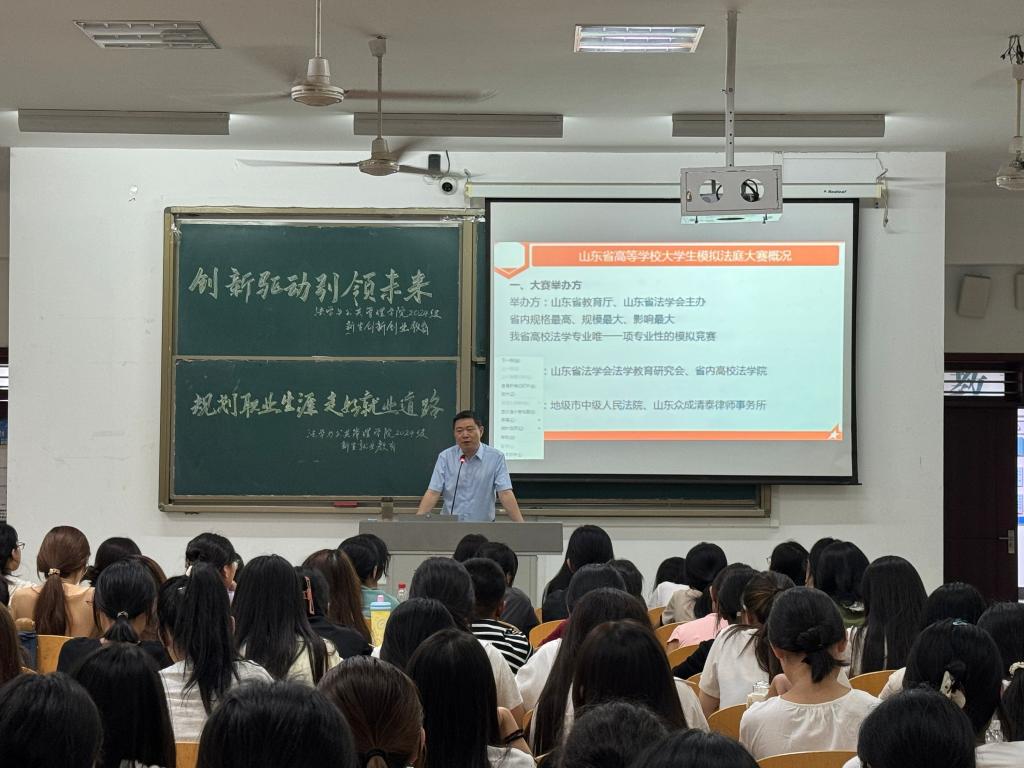 学院知名导师、“山东省高等学校大学生模拟法庭大赛”竞赛负责人王海鹏老师对模拟法庭大赛历史沿革、竞赛环节及评分规则等内容进行介绍,通过参赛图像资料向同学们生动而直观地展示了比赛现场情况,极大提升了学生对于创新活动的参赛积极性。