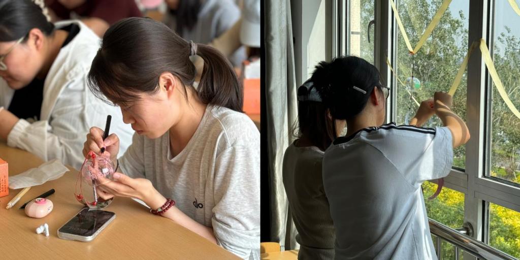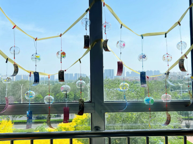 活动伊始,主讲人通过互动讲解,阐明活动意义与流程。首先,在匿名书写环节,同学们将内心的烦恼、困惑或感悟凝于笔尖,化作卡片上的私密心事。通过匿名形式,参与者得以卸下心理负担,自由表达真实情绪。随后,大家充分发挥想象力,用彩绘的形式精心制作DIY风铃,通过艺术创作,将情绪转化为可视化的色彩与形状,参与者们在专注中体验疗愈过程。创作完成后,大家将系有卡片的风铃共同悬挂于窗边,形成一片绚丽的“风铃墙”。微风拂过,清脆铃声与卡片上的心事交织,营造出充满共鸣的治愈氛围。活动尾声,主讲人为每位同学发放多肉植物与向日葵幼苗,并附赠养护指南,希望同学们通过日常照料植物的劳动实践,得以在生命成长中感悟责任与希望,将心理疗愈延伸至生活点滴。