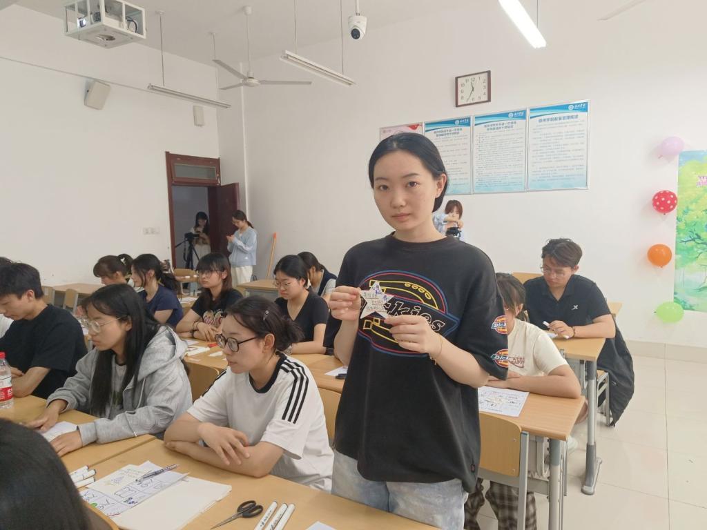 会议伊始,主讲人通过播放《海绵宝宝》动画片段引导同学们体悟“接纳不完美”的积极价值,并借助J.K.罗琳逆境中淬炼自我价值的真实故事,带领大家深入理解“在坚持与探索中实现自我价值”的心理成长启示。在“九宫格情绪驿站”环节,主持人组织同学们以图文结合的形式记录生活中的美好瞬间,通过分享独特快乐体验,启发同学们挖掘自身闪光点。随后,在经验交流与分享环节中,主持人邀请同学们畅谈感悟,鼓励其以自我关怀替代苛责,从日常点滴中发现个人价值。最后,主持人通过“心语果实树”互动环节,带领同学们绘制创意明信片,倾诉内心困惑与感动,并随机交换回复,在互动中实现情感共鸣与互助。这一环节进一步推进了同学们对自我价值的探索与认知,为个人成长注入了温暖而强大的动力。