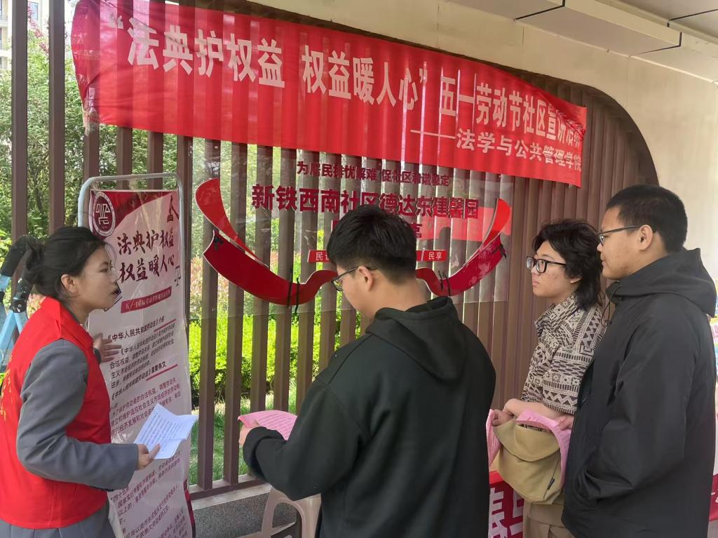 在第145个“五一”国际劳动节来临之际,为践行“法治为民”理念,2025年4月26日,pg娱乐电子游戏官网入口志愿者走进新铁西南社区,开展“法典护权益,权益暖人心”主题公益普法活动。活动通过多样化的形式,为社区居民送上法律“及时雨”,全力护航劳动者依法捍卫自己的权益,守护他们的合法权益。