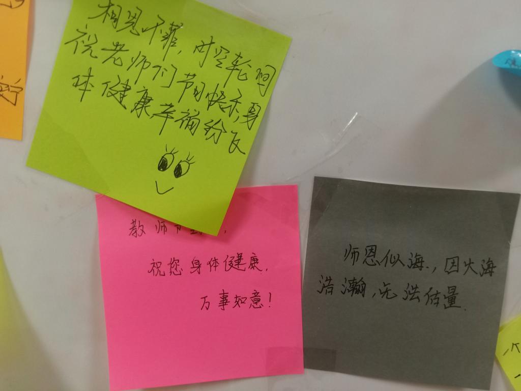 活动举办伊始,心理部成员通过微信、QQ等渠道进行活动宣传,使更多的同学了解活动时间和流程,参与到活动中来为老师献上祝福。活动中,同学们有序领取便利贴,认真的写下自己想对老师说的话诚,字字真情,句句诚挚。活动后,心理部成员将同学们写满祝福的便利签张贴在海报上,以便老师更好地接收到同学们的爱意。