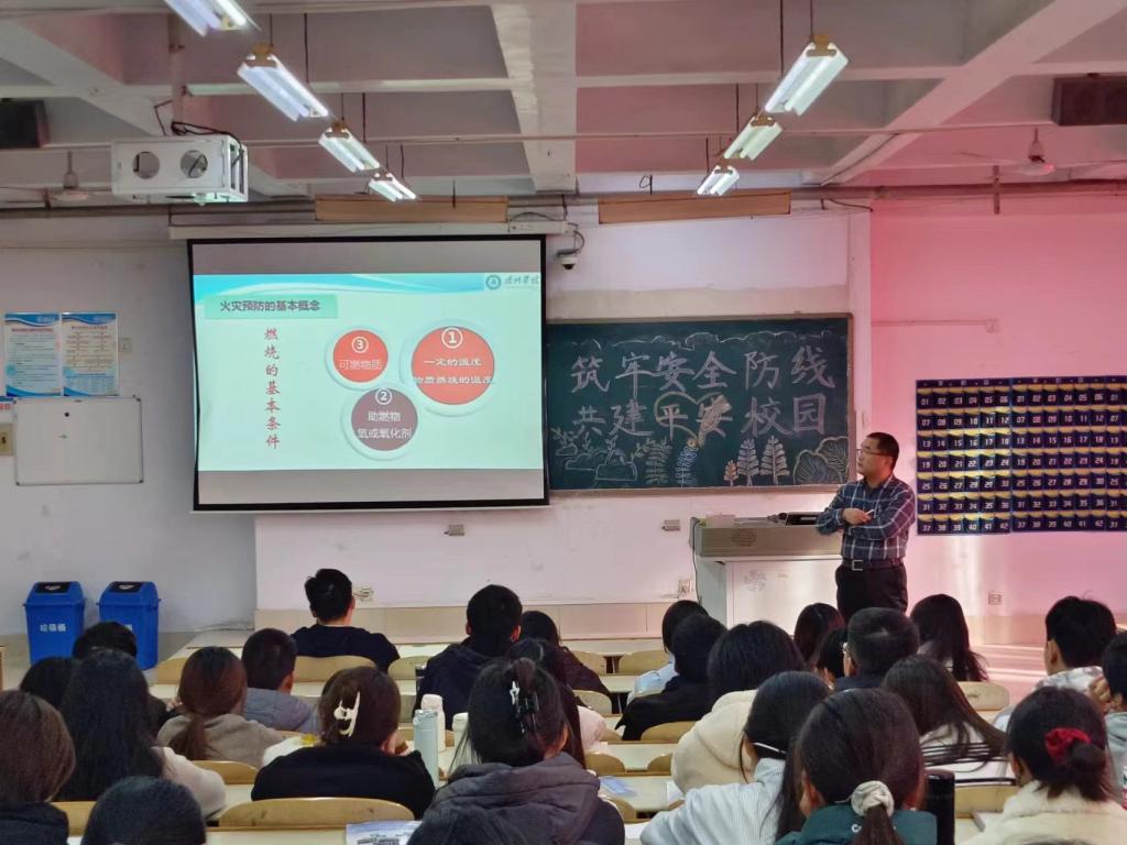保卫处刘树武老师结合自身工作,详细介绍了校园消防安全设施、安全防范机制、应急处理机制、物防、技防等工作情况,仔细讲解了校园内的安全通道、消防器材、电路电线、教学办公室、学生公寓及餐厅等防火防盗情况;针对大学生心理特征和现实安全需要,细致解说了发生在学生群体中常见的消防安全、交通安全、电信诈骗、心理健康、情感问题等方面的安全隐患、风险点及安全防范知识;结合发生在校园及其周边的真实案例,以培育和践行社会主义核心价值观和提升法律意识方面,分享了法治校园建设内容。