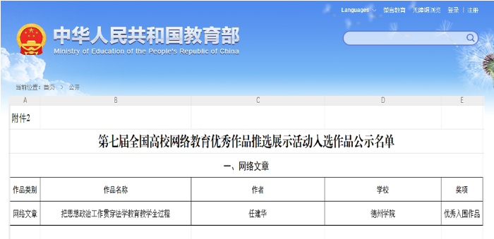 日前,由教育部思想政治工作司、中央网信办网络社会工作局联合举办的第七届“全国高校网络教育优秀作品推选展示活动”遴选结果公示,其中,pg娱乐官网任建华老师网络文章《把思想政治工作贯穿法学教育教学全过程》被评为优秀入围作品。