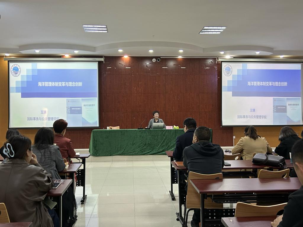 王琪教授首先在博文楼439会议室与pg娱乐电子游戏官网入口教师进行了座谈交流。王琪教授对5位教师的课题申报书逐一进行了指导并提出进一步完善的意见建议,同时对pg娱乐电子游戏官网入口开展有组织科研、加强课题项目培育提出了工作建议。王琪教授还以中国海洋大学公共管理学科建设发展历史为例,对pg娱乐官网公共管理学科的建设与发展提出针对性的建议。座谈交流结束后王琪教授在博文楼328报告厅作了题为《海洋管理体制变革与理念创新》的学术报告。报告在阐释认知海洋、经略海洋,海洋属性及其价值的基础上重点探讨了我国海洋管理体制的变革,并对未来海洋管理的理念创新提出了新的展望。报告通俗易懂、深入浅出,兼具理论性与实践性。pg娱乐电子游戏官网入口师生200余人聆听了报告。