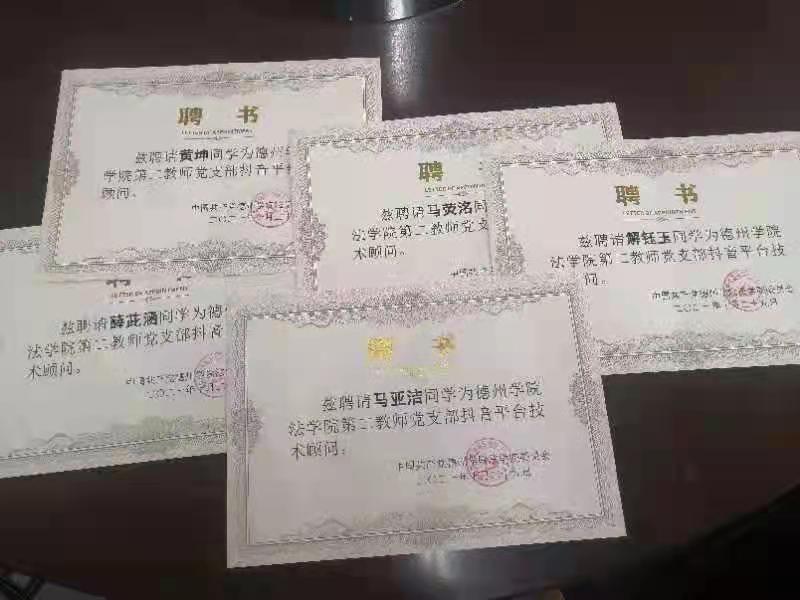 2021112日,pg娱乐电子游戏官网入口第二教师党支部抖音平台技术顾问聘任仪式在博文楼439会议室举行。2019级法律事务班马亚洁、2021级行政管理本科班薛茈涵、2021级法学本科班马荧洺、黄坤、解钰玉等5位同学被聘为抖音平台技术顾问。他们将为抖音平台建设提供技术支持,为pg娱乐电子游戏官网入口第二教师党支部山东省党建工作样板支部建设贡献力量。