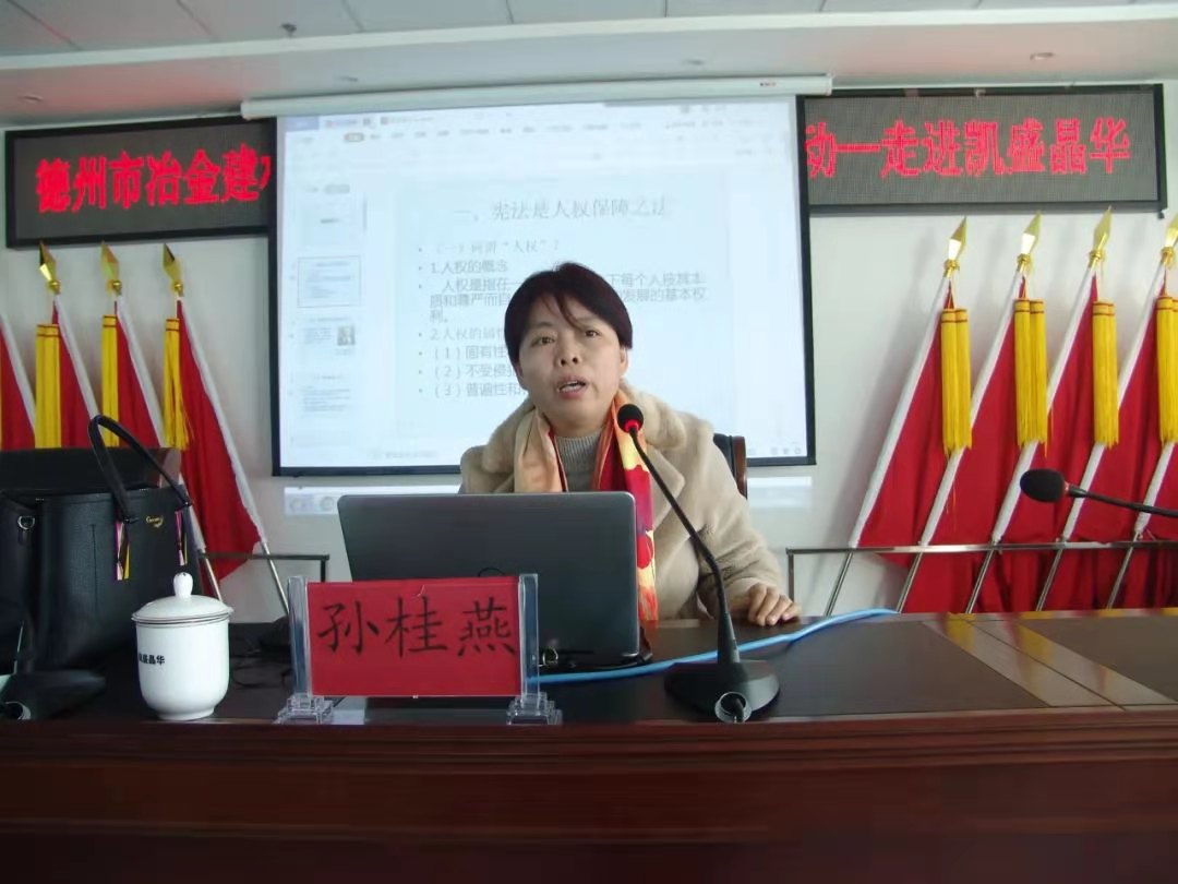 12月4日上午,在第七个国家宪法日到来之际,pg娱乐电子游戏官网入口孙桂燕副教授应邀为凯盛晶华玻璃有限公司做宪法宣传报告。德州市总工会党组成员、副主席孙刚同志,德州市总工会法律部部长英波同志,凯盛晶华玻璃有限公司副总经理、工会主席辛长平同志,凯盛晶华玻璃有限公司干部职工代表共计50余人听取了宪法宣讲报告。
