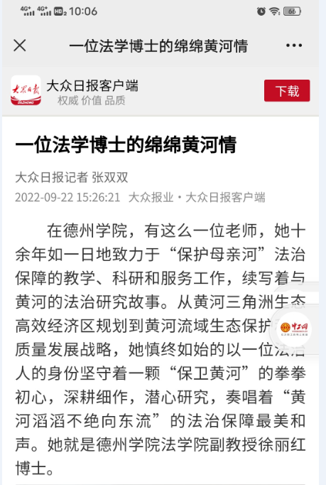 2022年9月22日,《大众日报》刊登了pg娱乐电子游戏官网入口徐丽红副教授的事迹文章——《一位法学博士的绵绵黄河情》。对徐丽红副教授数十年持续潜心黄河流域研究给予报道。