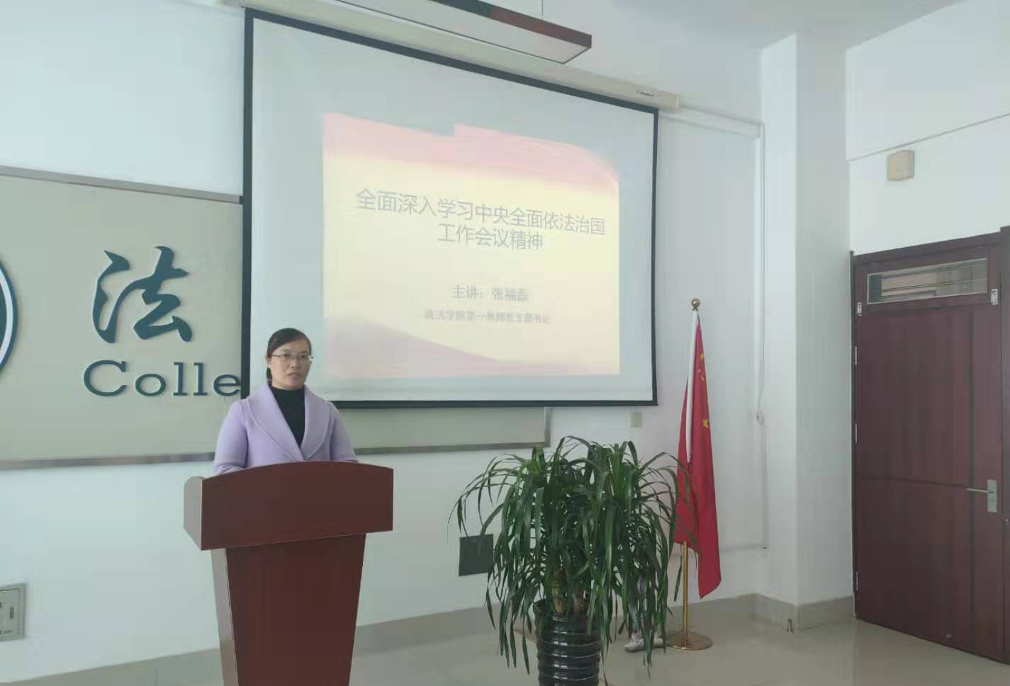 2020年11月24日下午,pg娱乐电子游戏官网入口第一教师党支部书记张福磊副教授在博文楼415党员活动室为第一教师党支部讲了一堂题为《全面深入学习中央全面依法治国工作会议精神》的党课。